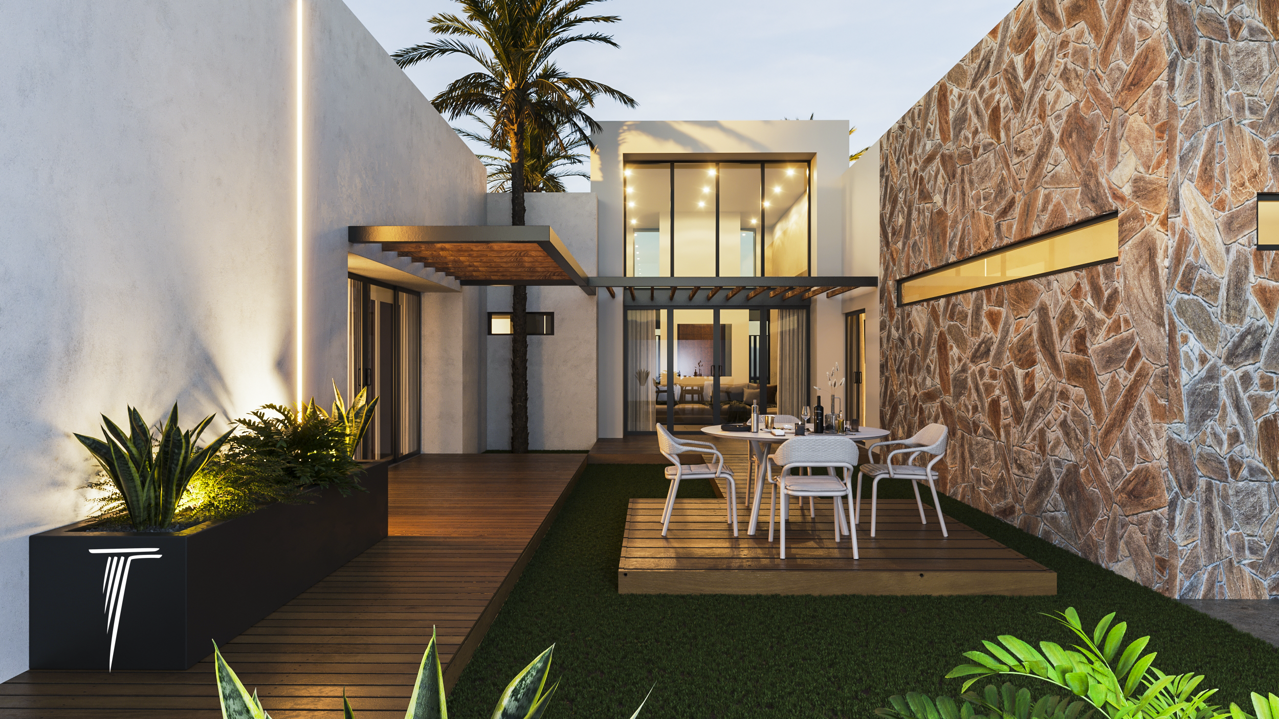 Casa residencial con una superficie total de construcción de 350 m². Incluye vestíbulo, sala, comedor, cocinas, 3 recámaras, 1 walking closet, 2 baños completos, 1/2 baño y terraza central.