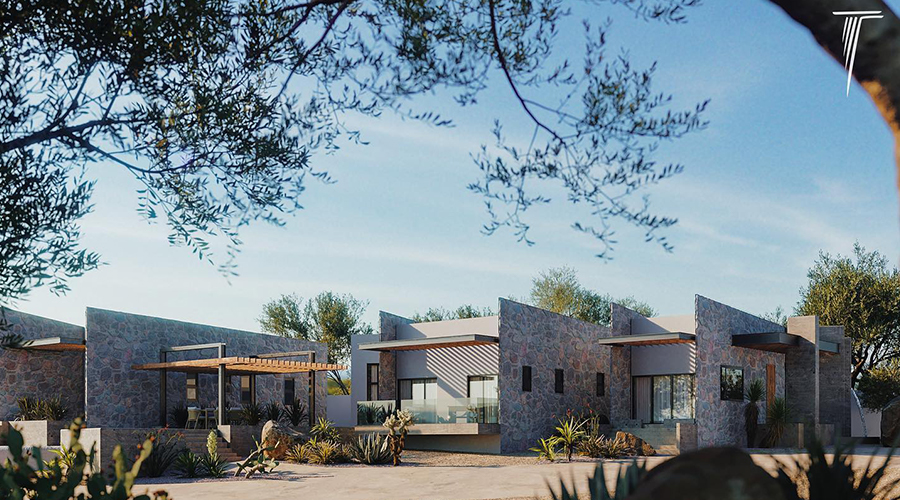 Conjunto de una casa habitación y dos cabañas para arrendamiento, con una superficie total de construcción de  240.57 m², la casa incluye sala, cocina, comedor, 3 recámaras, 2 baños completos. Las 2 cabañas incluyen un área común, recámara y 1 baño completo, el área exterior contempla terraza y área de asador.