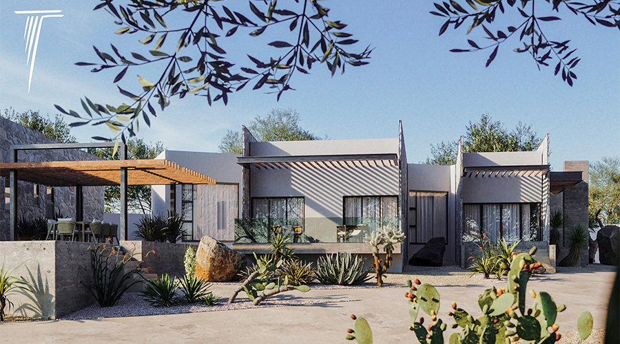 Conjunto de una casa habitación y dos cabañas para arrendamiento, con una superficie total de construcción de  240.57 m², la casa incluye sala, cocina, comedor, 3 recámaras, 2 baños completos. Las 2 cabañas incluyen un área común, recámara y 1 baño completo, el área exterior contempla terraza y área de asador.